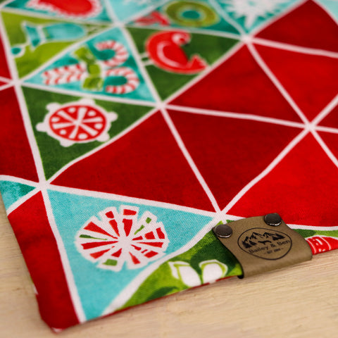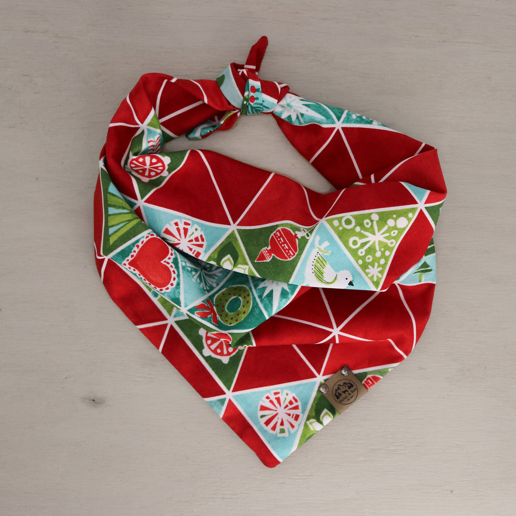 Our bandanas are a traditional triangle shape with no snaps that may break or rust. Our bandanas can be rolled across the top to adjust the length and tied onto your pet for a perfect fit. Please measure your pets neck before ordering to make sure you snag the right size.