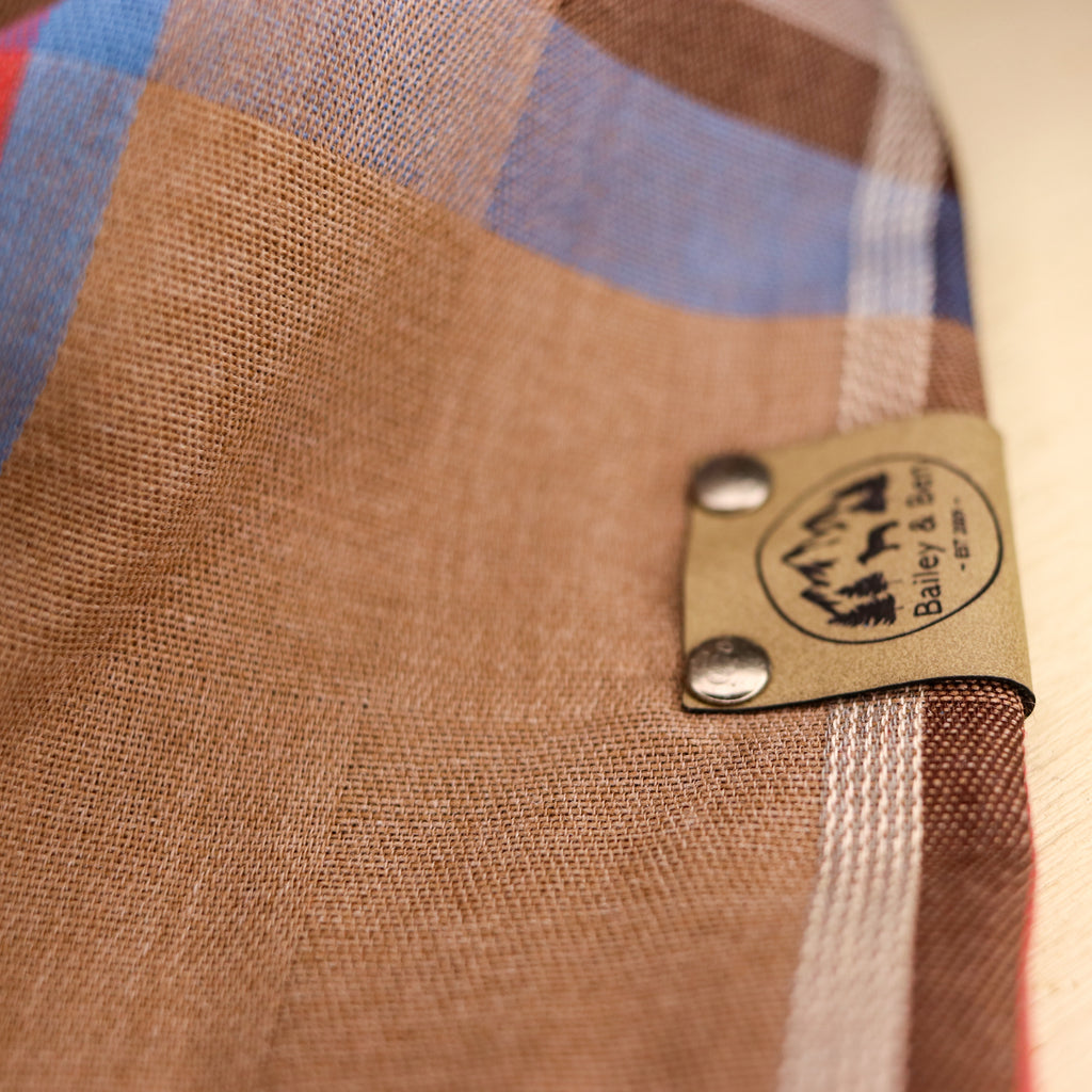 Our bandanas are a traditional triangle shape with no snaps that may break or rust. Our bandanas can be rolled across the top to adjust the length and tied onto your pet for a perfect fit. Please measure your pets neck before ordering to make sure you snag the right size.